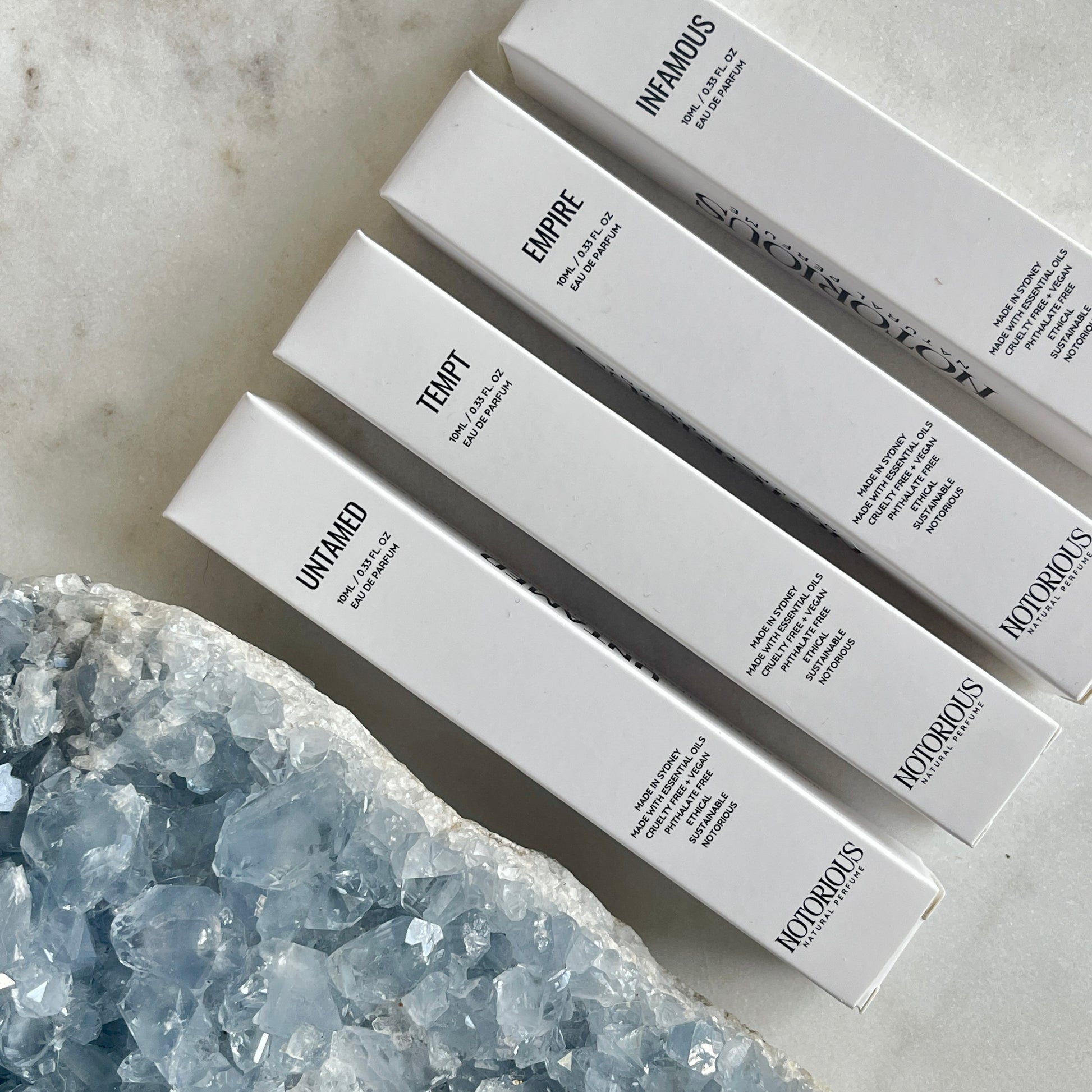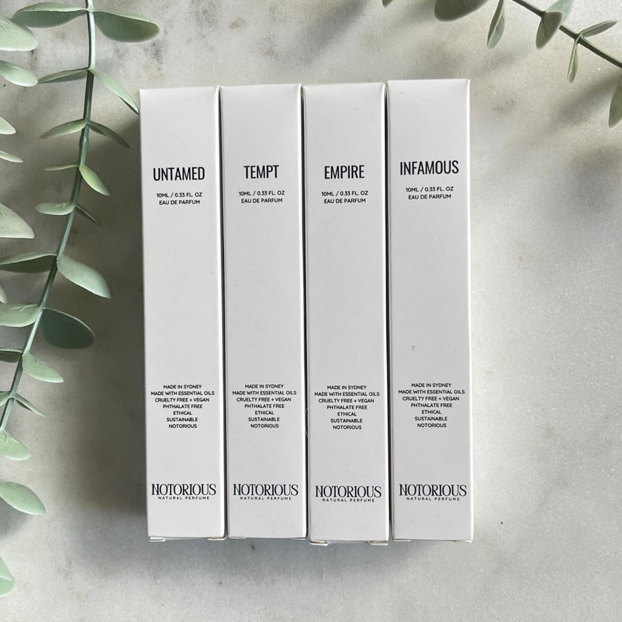 Explore Notorious Perfume in it's full size glory. Delight in our curated selection of natural, sustainable fragrances, each telling its own unique story. Perfect for the conscious connoisseur, our sample pack is the gateway to finding your signature scent.